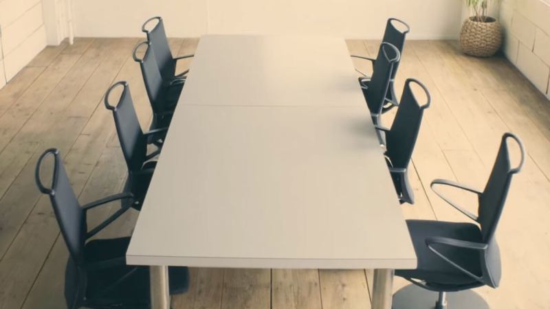 To send the wheeled robo-chairs packing — and neatly under desks, where they darn well should be after meetings and such — users simply clap their hands once. Raw power, right in the palm of your delicate white-collar hand.
