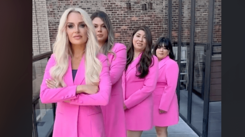 The shot then switches to Martinez and three of her colleagues dressed in bright pink hues, suit jackets and all, which states “So I started my own firm with a pink brand and took/stole their clients in the process.”