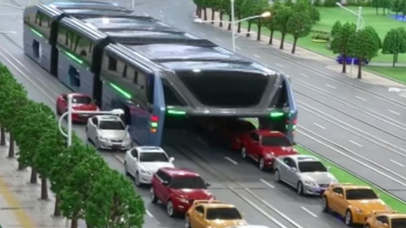 Plans for this elevated bus were unveiled at the recent China Beijing International High-Tech Expo, according to the Shanghaiist. The basic idea is that passengers can ride higher up, allowing usual traffic to pass by underneath.