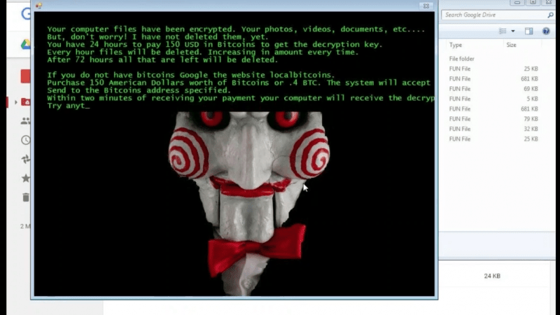 Other software takes a more sinister approach. One program Datto investigated (pictured above) used the clown character from the Saw film franchise and threatened to delete a file for every hour that the ransom went unpaid.